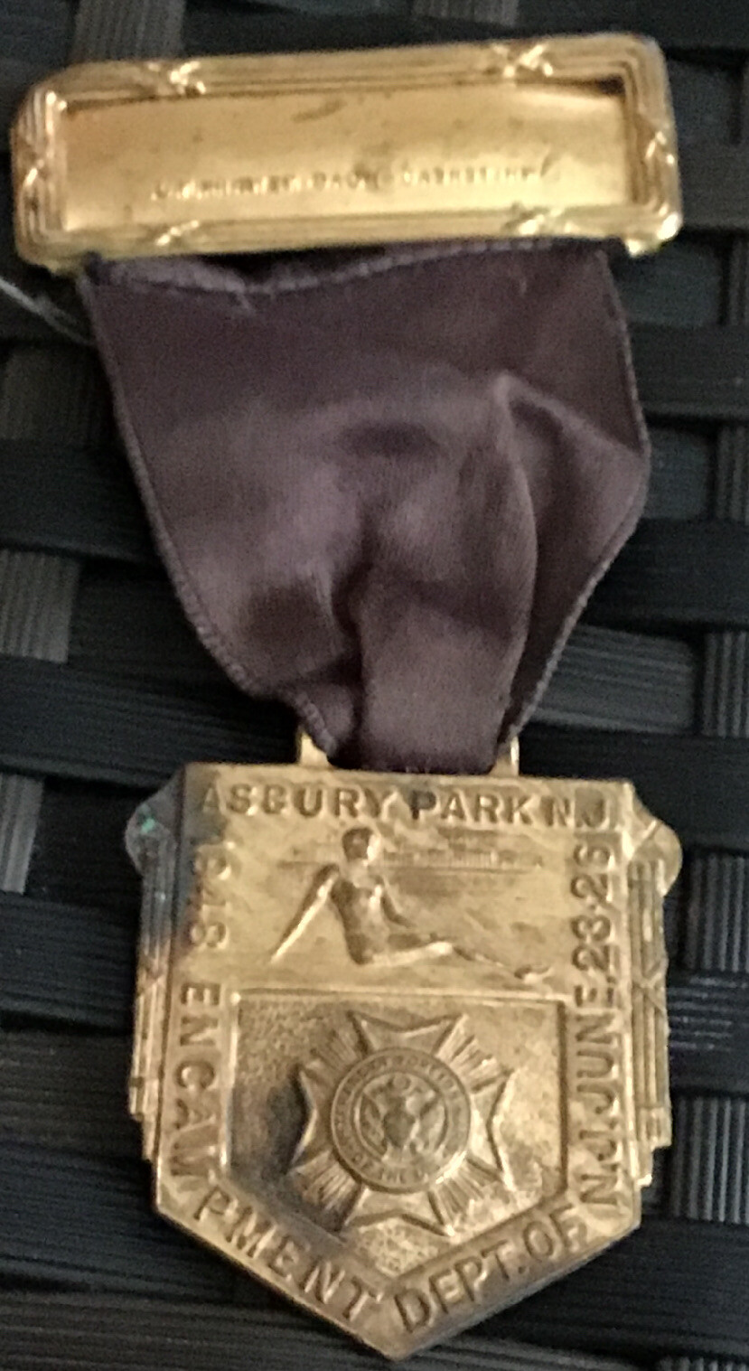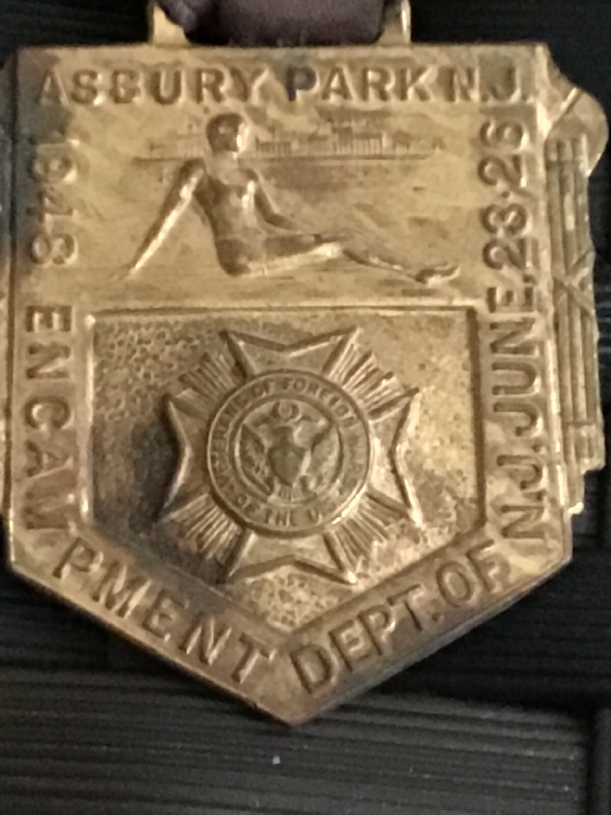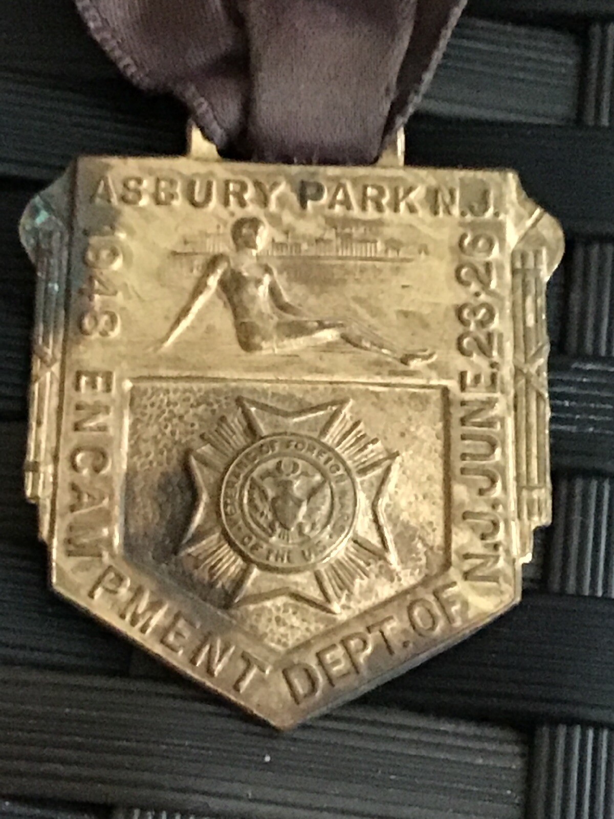1948 Encampment Asbury Park New Jersey NJ Ribbon Badge VFW Veterans Foreign Wars. Condition is Used. 1 1/2" by 1 3/4" bronze badge