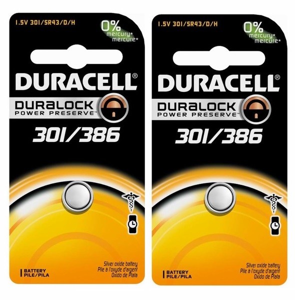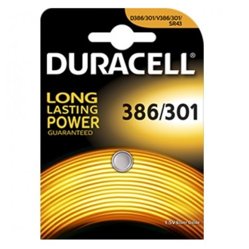 Duracell 1.5 V Silver Oxide replacement battery can be used for watches, thermometers, handheld games, calculators and more.  Duracell 1.5V Medical/Electronic 301/386 Button Cell Battery is designed to provide an exceptionally reliable power for a variety of medical devices, watches, calculators and other electronics. This 301/386-Size Battery features a Silver Oxide chemistry that ensures a long-lasting energy, constant voltage of 1.5V and generous capacity of 130 mAh. The Battery composition is Mercury-free and therefore is friendly to the environment. 3 years shelf life allows to store the battery and have it ready for use any time you need it. The Battery measures 0.46" in diameter and 0.17" in height.