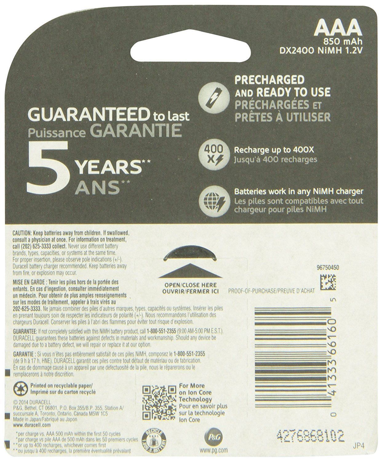 Duracell Rechargeable AAA Pre-Charged batteries let you charge hundreds of times, helping you save hundreds of dollars, and are 50% longer-lasting per charge.* With a Long-Life Ion Core, you get more power in every battery. They come pre-charged and will hold their charge longer than ever before.** Plus, they are guaranteed to last for 5 years and, with Duralock Power Preserve Technology, they’ll hold a charge for up to 1 year when not in use. These powerful NiMH batteries work in any NiMH charger, and you can recharge them up to 400 times. With a longer-lasting charge and fewer recharges, Duracell Rechargeable AAA Pre-Charged batteries really do set themselves apart from the rest.