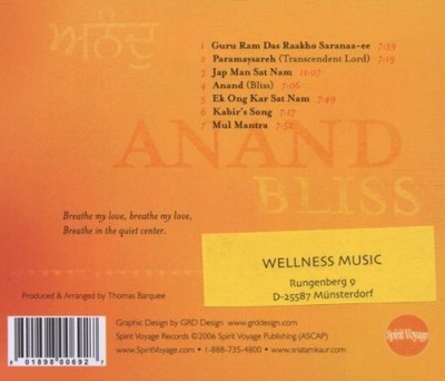 On Snatam s timeless album, Anand, layers of musical alchemy weave an incredible landscape behind Snatam's ethereal and deeply prayerful vocals. Her music carries a message of profound bliss and joy which uplift the spirit and is the perfect background for inspiration, relaxation, and yoga. Review Anand means bliss. The newest release by Snatam Kaur has beautiful soothing, yet uplifting tones to help us connect with our inner peace. Her melodic, calming voice carries a message of profound bliss and joy. Instrumental layers of guitar, keyboard, flute, harmonium, sarod and tabla create the perfect harmonious background for Snatam s vocals. Her message permeates her sounds, May each of us be an instrument of peace, may we dance with joy, love with our hearts, and know that the depth and strength of our Spirit can and will heal all, and bring peace to the planet. --Sandy Anderson, Natural Awakenings Magazine