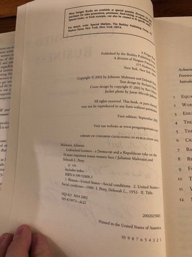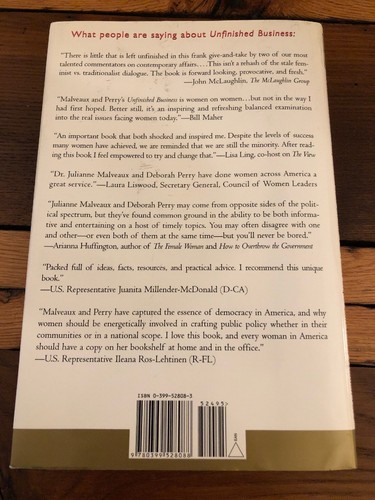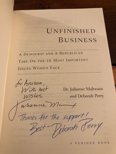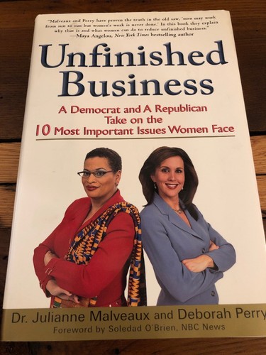 Review Malveaux and Perry's Unfinished Business is an inspiring and refreshing balanced examination into the real issues facing women today. -- Bill MaherThe book is forward looking, provocative, and fresh. -- John McLaughlin[Every] woman in America should have a copy of Unfinished Business on her bookshelf at home and in the office. -- U.S. Representative Ileana Ros-Lehtinen Read more About the Author Dr. Julianne Malveaux, a Democrat and an acclaimed economist, is a syndicated columnist whose commentary on economics and politics has appeared in the Los Angeles Times, the San Francisco Chronicle, the Detroit Free Press, and other publications. She is a contributing writer to Essence Magazine and also writes regularly for USA Today and Black Issues in Higher Education. She is a television and radio commentator who appears regularly on CNN, PBS, MSNBC, and Fox News. Malveaux lives in Washington, D.C.Deborah Perry, a Republican, is a political commentator who appears on MSNBC and FOX NEWS. She is a former congressional staffer in the U.S. Senate and House of Representatives, Bush administration official, and congressional lobbyist who has worked for change in the areas of foreign policy, education reform, and national and community service. As a freelance writer, she has written for such publications as Ladies Home Journal, the Miami Herald and National Geographic Traveler. She lives in Arlington, Virginia. Read more