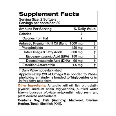 Ingredients Antarctic Premium Krill Oil Blend, Phospholipids, Total Omega 3 Fatty Acids, Eicosapentaenoic Acid (EPA), Docosahexaenoic Acid (DHA), Estrified Astaxanthin
