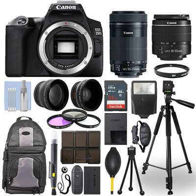 Whether you're a first-time SLR user, an aspiring photo enthusiast, or someone looking to capture those amazing family moments, the Canon EOS 250D can be the perfect companion. It's an incredibly small and light EOS DSLR camera, which is equipped with 4K recording capability, Canon's Dual Pixel CMOS AF, and a vari-angle LCD for selfies and fun angles. Its 24.1 megapixel (APS-C) CMOS sensor is combined with the powerful DIGIC 8 Processor for amazing performance and results, and the EOS 250D lets you channel your creativity with functions like 4K Time-lapse Movie and Creative Assist. Wherever you are and wherever you go, the EOS 250D camera makes it simple to capture stunning photos and videos to view and share.