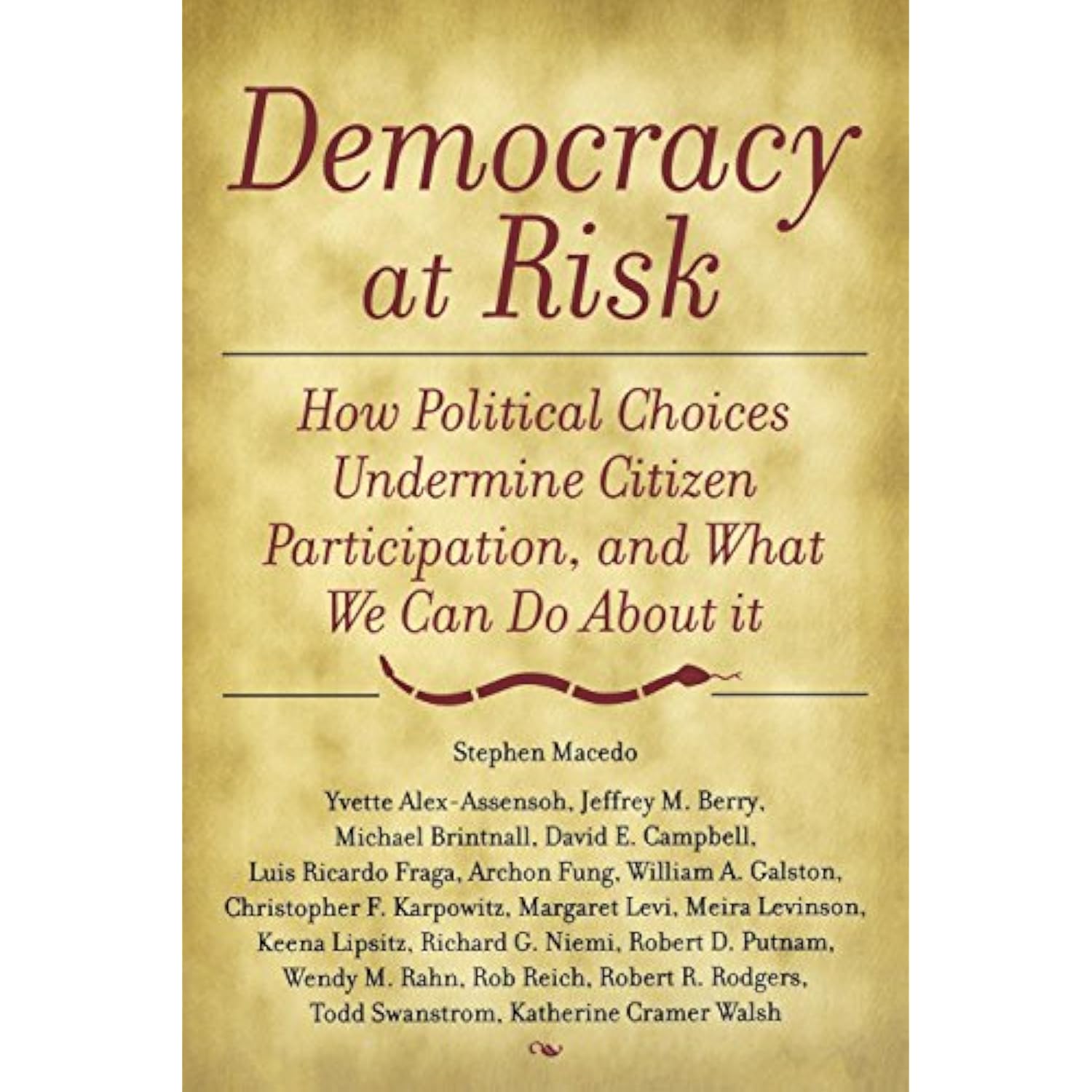 Product Description Voter turnout was unusually high in the 2004 U.S. presidential election. At first glance, that level of participation—largely spurred by war in Iraq and a burgeoning culture war at home—might look like vindication of democracy. If the recent past is any indication, however, too many Americans will soon return to apathy and inactivity. Clearly, all is not well in our civic life. Citizens are participating in public affairs too infrequently, too unequally, and in too few venues to develop and sustain a robust democracy. This important new book explores the problem of America's decreasing involvement in its own affairs. D emocracy at Risk reveals the dangers of civic disengagement for the future of representative democracy. The authors, all eminent scholars, undertake three main tasks: documenting recent trends in civic engagement, exploring the influence that the design of political institutions and public policies have had on those trends, and recommending steps that will increase the amount and quality of civic engagement in America. The authors focus their attention on three key areas: the electoral process, including elections and the way people get involved; the impact of location, including demographic shifts and changing development patterns; and the critical role of nonprofit organizations and voluntary associations, including the philanthropy that help keep them going. This important project, initially sponsored by the American Political Science Association, tests the proposition that social science has useful insights on the state of our democratic life. Most importantly, it charts a course for reinvigorating civic participation in the world's oldest democracy. The authors: Stephen Macedo (Princeton University), Yvette Alex-Assensoh (Indiana University), Jeffrey M. Berry (Tufts), Michael Brintnall (American Political Science Association), David E. Campbell (Notre Dame), Luis Ricardo Fraga (Stanford), Archon Fung (Harvard), William A. Galston (University of Maryland), Christopher F. Karpowitz (Princeton), Margaret Levi (University of Washington), Meira Levinson (Radcliffe Institute), Keena Lipsitz (California–Berkeley), Richard G. Niemi (University of Rochester), Robert D. Putnam (Harvard), Wendy M. Rahn (University of Minnesota), Keith Reeves (Swarthmore), Rob Reich (Stanford), Robert R. Rodgers (Princeton), Todd Swanstrom (Saint Louis University), and Katherine Cramer Walsh (University of Wisconsin). Review "An Outstanding Academic Title" — CHOICE, 1/1/2006 "An important resource for teaching and for guiding further research on citizen participation. It is clearly written and accessible to people outside as well as within the academy. An impressive collaboration of which political scientists can be proud, this book should be of interest to all who care about the state of citizenship and what may be done to improve it." —Theda Skocpol, Harvard University "This is a 'must read' book for those interested in democracy and American politics. It makes the reader ponder what democracy is about, how we are doing, and what the prospects are for the future....This book is an important contribution to the contemporary debate on American democracy." —Russell Dalton, University of California, Irvine, Democracy & Society "These scholars have made a valuable contribution to our understanding and potentially have instigated an ongoing and deliberative discussion on this important topic. Political scientists and the general public will find the report interesting and informative. Democracy at Risk would be a useful secondary textbook for classes in American politics." —James L. Danielson, Minnesota State University Moorhead, Perspectives on Political Science, 9/1/2006 "this book presents an excellent sketch not only of contemporary American political life, but of the debates about engagement, civic vitality and individual freedom which cut across a range of disciplines, and as such it is an importan