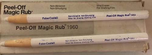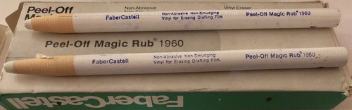 Faber Castell Peel Off Magic Rub Vinyl Eraser Sticks #1960 / 74201 You Get 2 NOS sticks. These are the older version with grey erasers. If you want the newer version with the white erasers by Sanford, I have those in another listing.