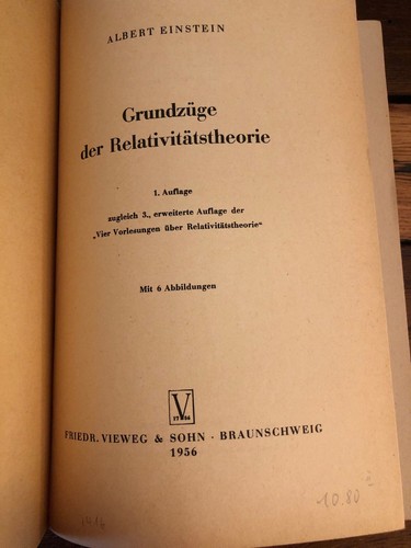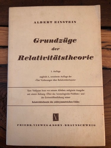 Grundzüge der Relativitätstheorie. 1. Auflage zugleich 3., ERWEITERTE Auflage der "Vier Vorlesungen über Relativitätstheorie". Vom Verfasser kurz vor seinem Ableben redigierte Ausgabe mit einem Anhang "Über das kosmologischer Problem" und der Erstvertöffentlichung seiner Relativitätstheorie der nichtsymmetrischen Feldes