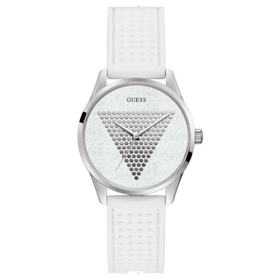 Guess womens watch. Silver stainless-steel case and white Plastic strap. White dial. Japanese quartz movement. Buckle closure. Water resistance of 30 meters.