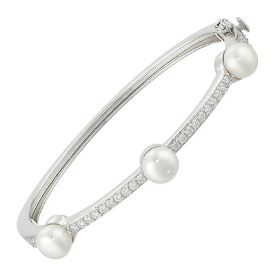Deliver to: Columbus Ships in 24/48 hrs Get an updated take on the classic pearl bracelet with this cubic zirconia-studded piece! Three freshwater cultured pearls, 7.5-8 mm, are stationed along this hinged sterling silver bangle, separated by a row of round-cut white cubic zirconia for added shine. Box clasp with tongue and safety. Piece measures 6 3/4 inches in circumference.