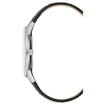 Men's watch Round stainless steel case with silver finish Silver dial with Roman numerals Genuine diamond accent at 12 oclock Black leather croc textured strap
