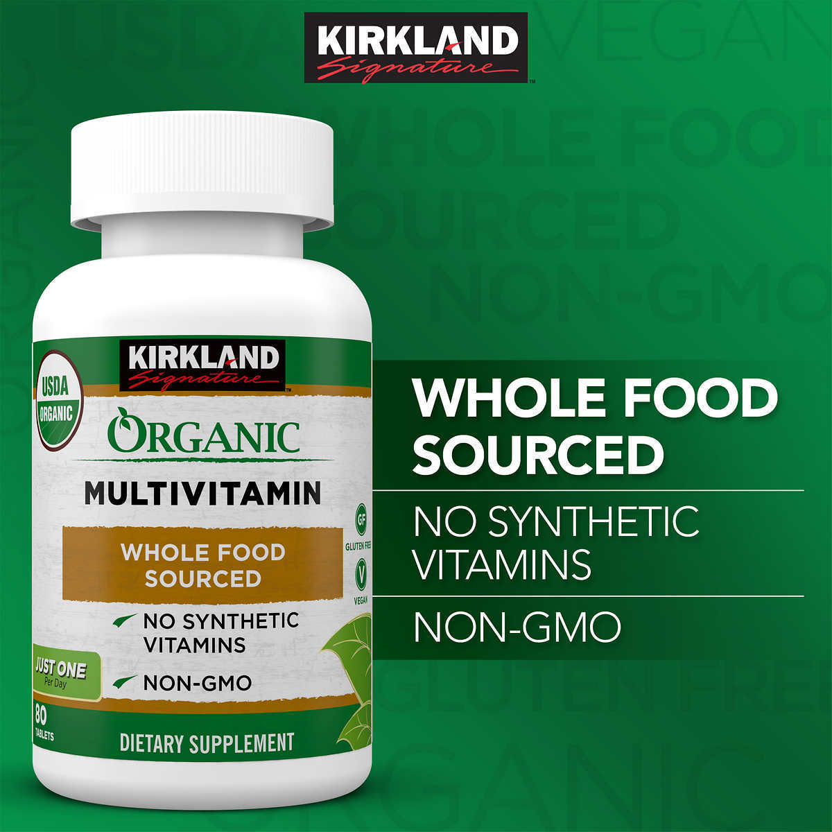 Kirkland Signature™ Organic Multivitamin is a complete formula with 19 vitamins and minerals. It is USDA certified organic and Non-GMO Project Verified. It is vegan, gluten free, and has no synthetic vitamins or artificial colors, flavors or preservatives. Whole food sourced, plant based and organic — nutrition as nature intended.