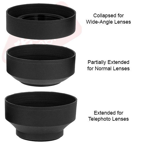 This Pro Series Soft Rubber Lens Hood prevents image-degrading lens flare by blocking stray light from striking the surface of the lens. It also assists in keeping moisture or wind blown debris off the lens. It protects the front barrel from the inevitable impacts against walls, door frames and other real life obstacles. It collapses for wide angle and extends for telephoto!