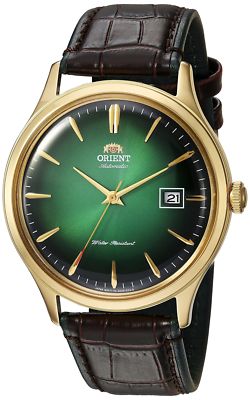 Orient AC08002F Bambino 4 men's automatic watch features a 43mm wide and 12mm thick yellow gold plated solid stainless steel case with a fixed bezel and textured push-pull crown. Orient AC08002F is powered by a precise Japanese F6724 automatic movement with 22 jewels. This stylish watch also features a sharp looking green gradient dial with gold tone luminous hands and index hour markers along with the 40-hours power reserve and date display functions, scratch resistant domed mineral crystal and water resistant to 30 meters. Orient AC08002F is equipped with a 22mm wide brown stitched genuine brown leather strap with a buckle clasp. Orient AC08002F men's Bambino 4 green dial brown leather strap power reserve automatic watch is brand new and comes in an original Orient gift box and is backed by a 1 year limited warranty. On the surface, it might be easy to mistake the Bambino Version 4 with the original Bambino. For this fourth iteration of the timeless collection, we chose to move back to its roots, all the while taking inspiration from previous models along the way. Sure, the signature domed crystal is there, but unlike the original Bambino, the hour markers on the Version 4 are rounded and diamond shaped. The hands are a lot thinner (which is perhaps a hat tip to the Version 2), and the seconds hand has been partially dipped with a red accent. The sunburst dial colors are striking as well: the midnight blue and emerald models feature an ombre-like transition which is most likely attributed to the domed dial. The new Bambino Version 4 has become slight larger, moving away from the traditional 40.5mm width of previous models and instead becoming a modern 42mm across. The movement is identical to those seen in the 2nd Generation Bambino Version 1 and 2 and are completely automatic, hand-winding, hacking. The straps are also unique, especially with the use of color contrast in the leather lining.