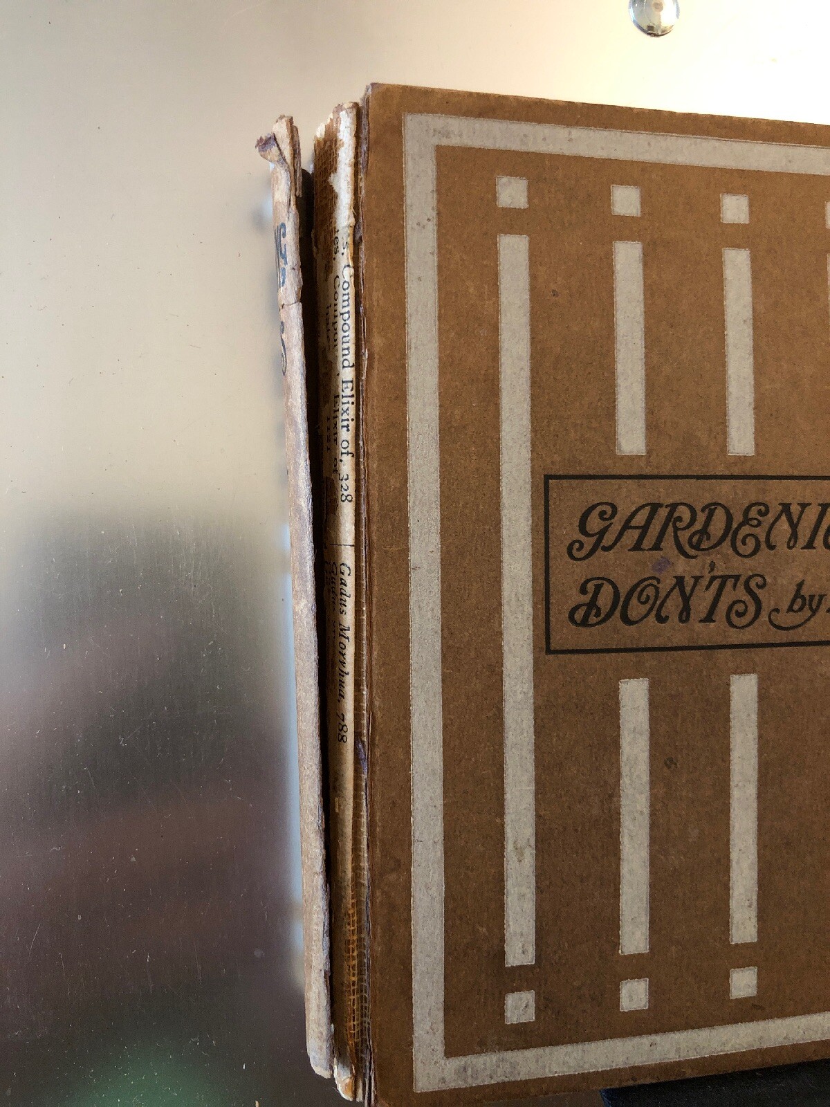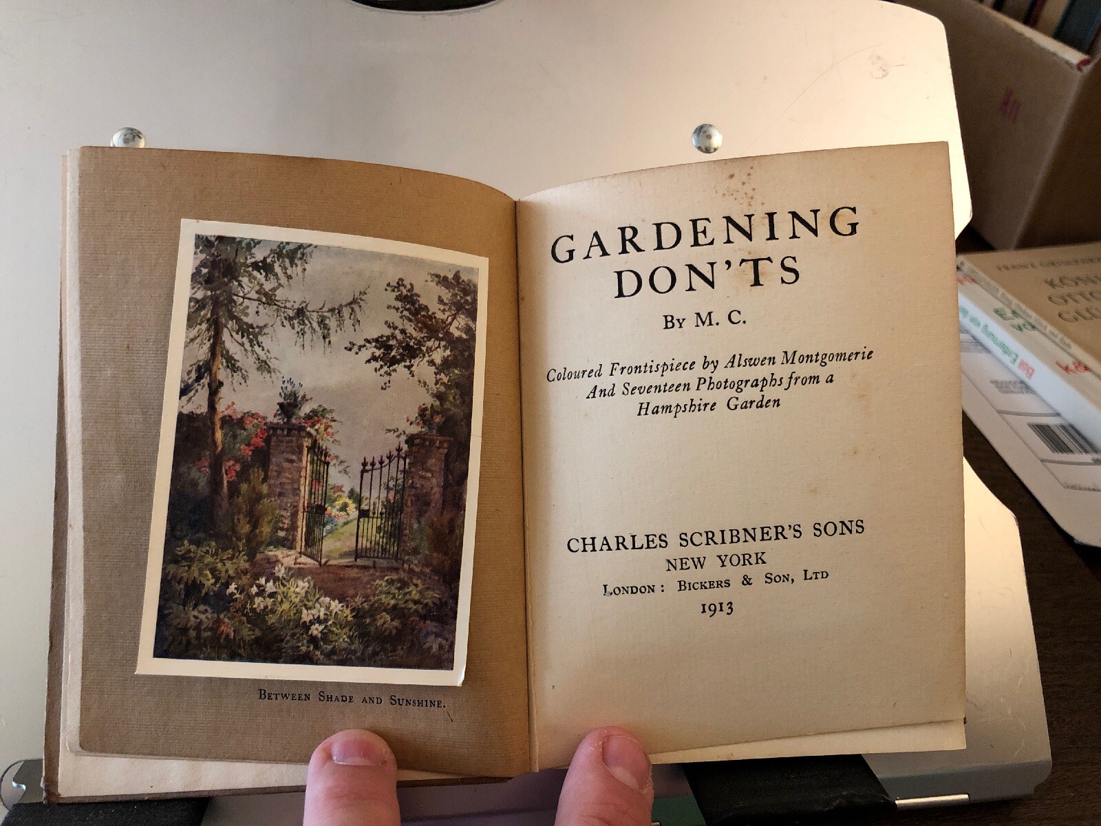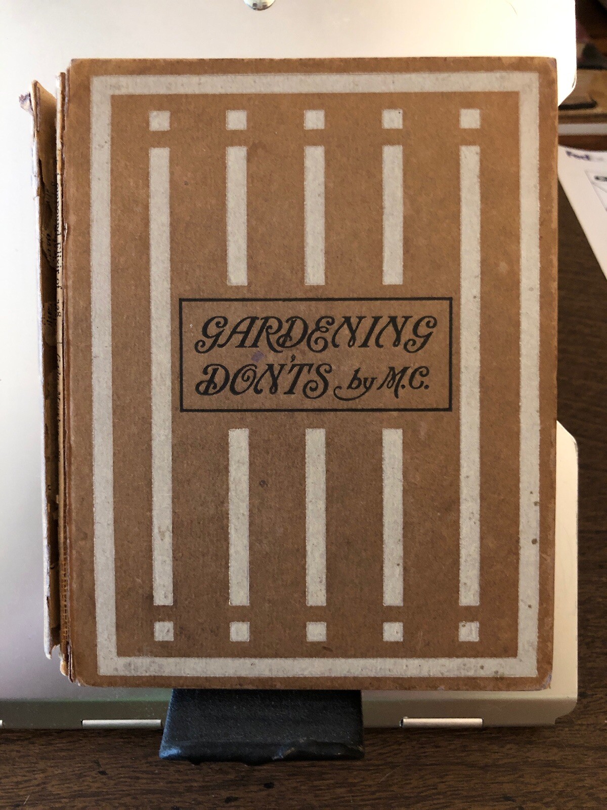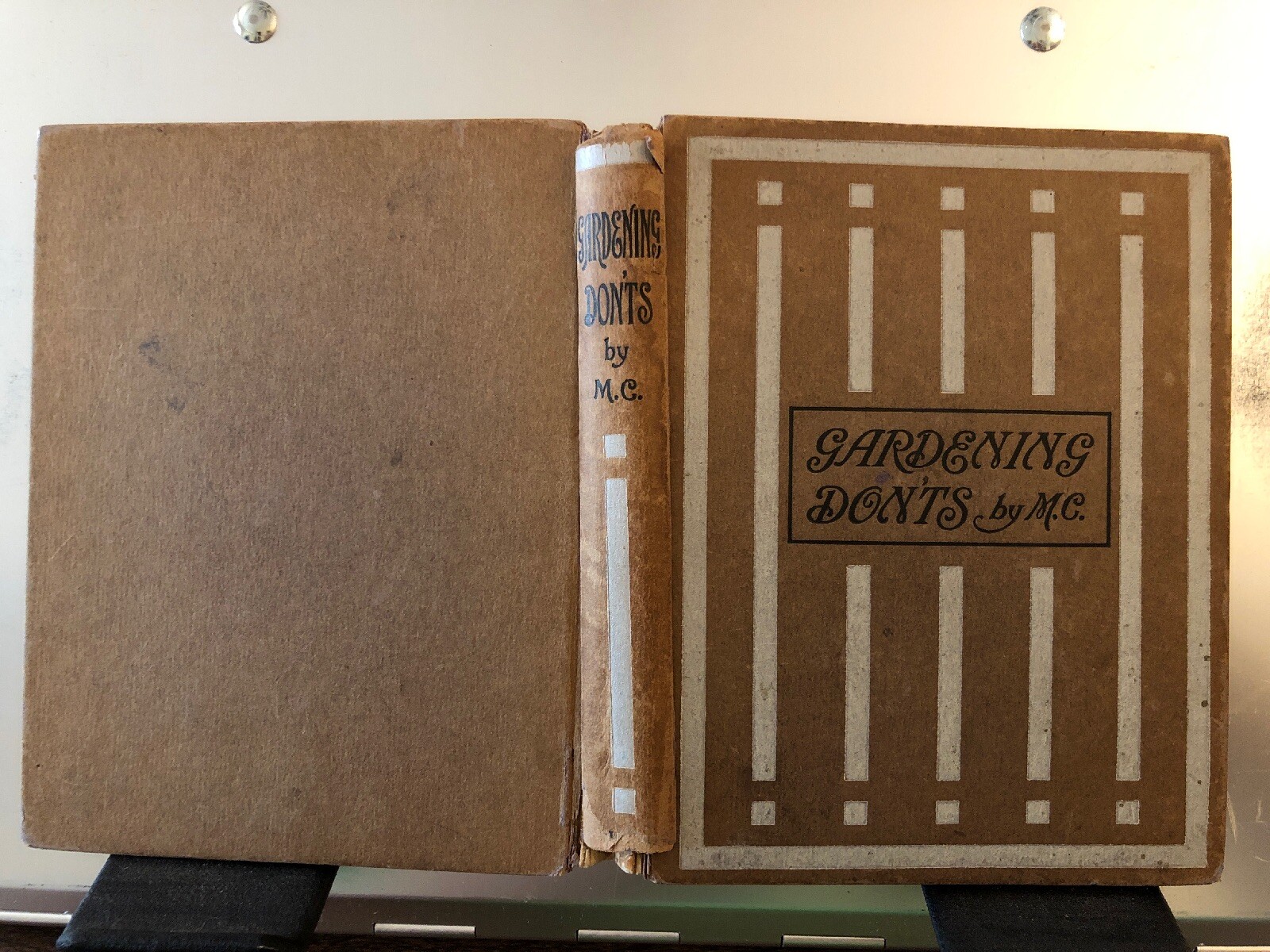 GARDENING DON'TS by M.C (Marion Chappell) 1914 Humor & 17 Photos from Hampshire garden. A very rare book. All the photos are pasted into the book as opposed to printed on the page. Slight brown mottling to the paper due to age. This is the third 1st edition hardcover printed in 1913 by charles scribner's sons / bickers & son ltd. measures 11 x 14 x 2 cms with 56 pages. A nice little book for the gardening collector. coloured frontispiece by Alswen Montgomerie.