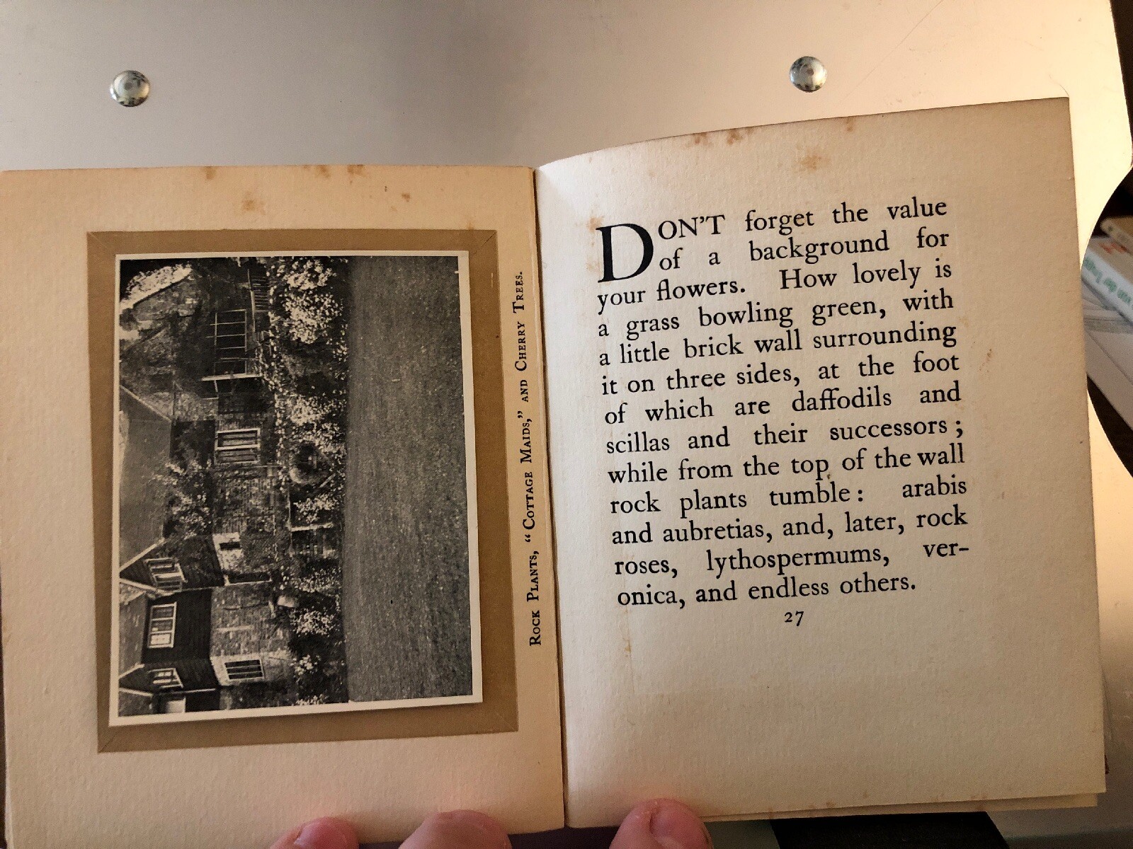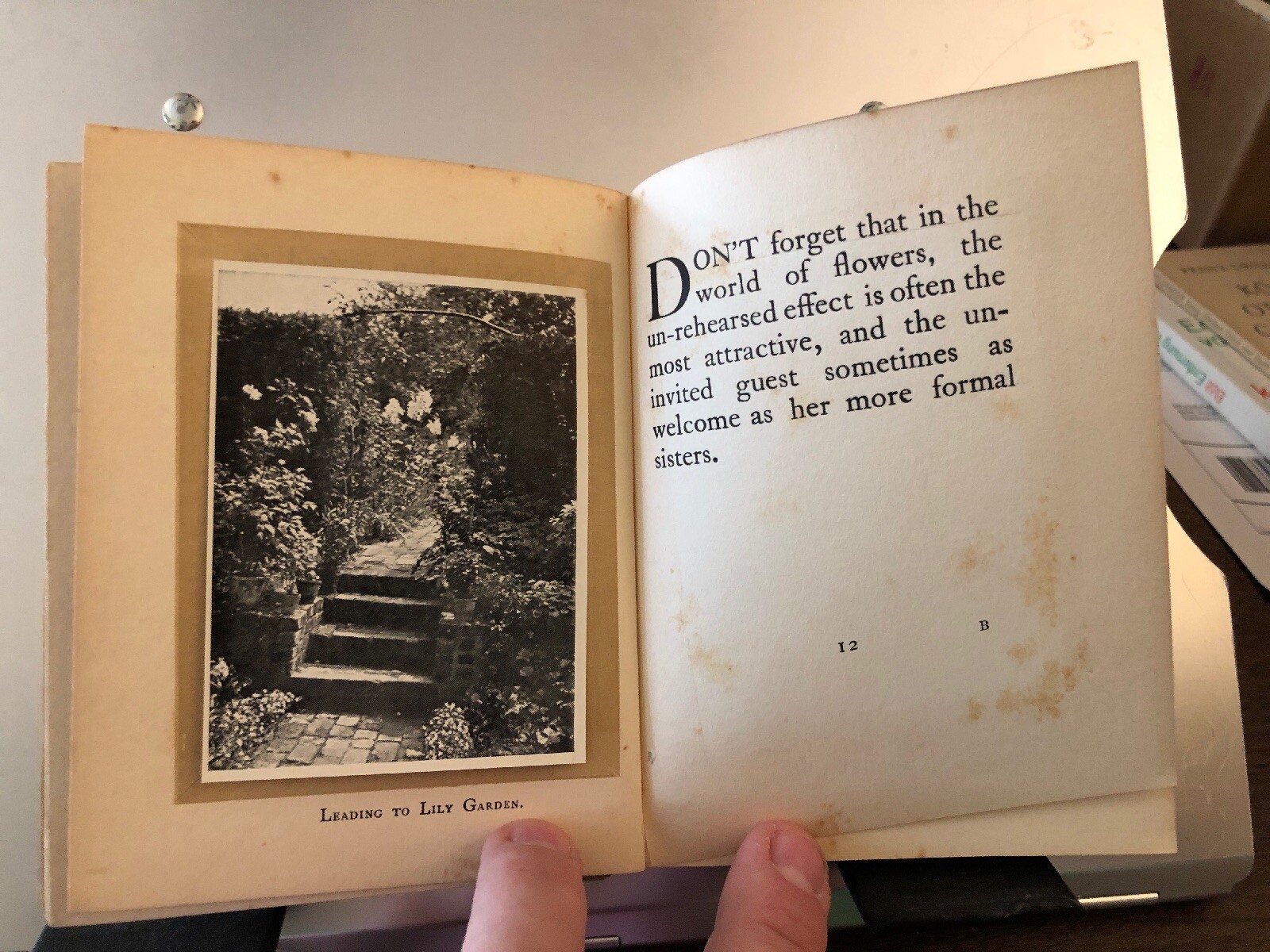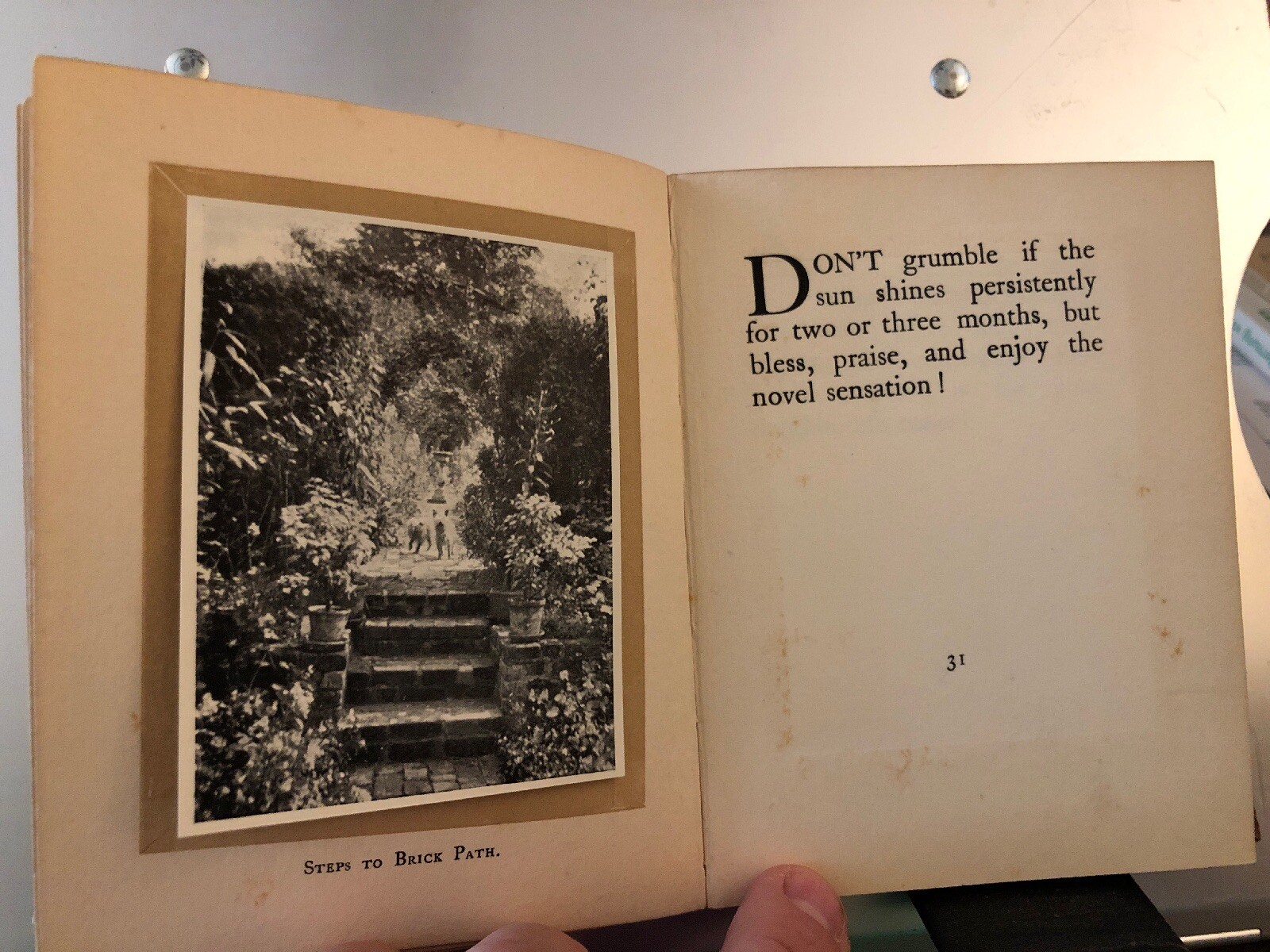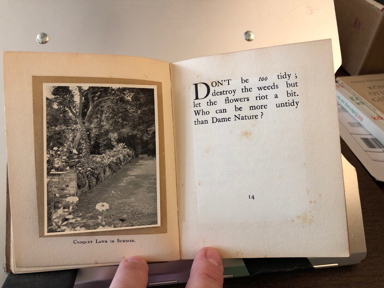 GARDENING DON'TS by M.C (Marion Chappell) 1914 Humor & 17 Photos from Hampshire garden. A very rare book. All the photos are pasted into the book as opposed to printed on the page. Slight brown mottling to the paper due to age. This is the third 1st edition hardcover printed in 1913 by charles scribner's sons / bickers & son ltd. measures 11 x 14 x 2 cms with 56 pages. A nice little book for the gardening collector. coloured frontispiece by Alswen Montgomerie.
