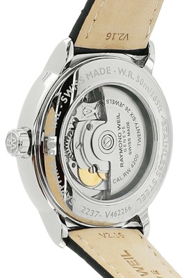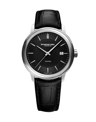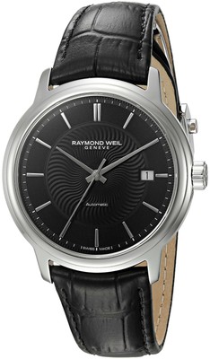 Raymond Weil, Maestro Automatic Date, Men's Watch, Stainless Steel Case, Leather Calf Skin Strap, Swiss Mechanical Automatic (Self-Winding), 2237-STC-20001 Traditional design, The black dial offers a date window at 3 o'clock and the mechanism is automatic - simply wear it to recharge it.