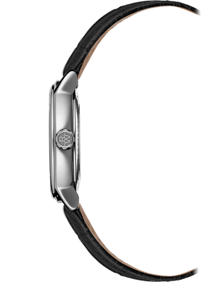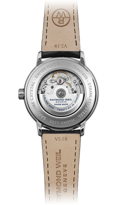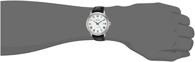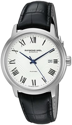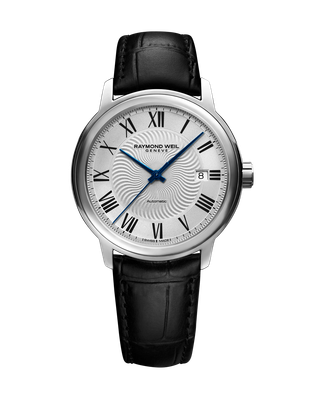 Stainless steel case with a black leather strap. Fixed stainless steel bezel. Silver dial with blue hands and Roman numeral hour markers. Minute markers around the outer rim. Dial Type: Analog. Date display at the 3 o'clock position. Automatic movement. Scratch resistant sapphire crystal. Transparent case back. Case size: 39 mm. Case thickness: 9 mm. Round case shape. Deployment clasp. Water resistant at 50 meters / 165 feet. Functions: date, hour, minute, second. Additional Info: in general, suitable for short periods of recreational swimming, but not diving or snorkeling. Luxury watch style. Watch label: Swiss Made. Raymond Weil Maestro Automatic Silver Dial Mens Watch 2237-STC-00659. Traditional design, The silver dial offers a date window at 3 o'clock and the mechanism is automatic - simply wear it to recharge it.