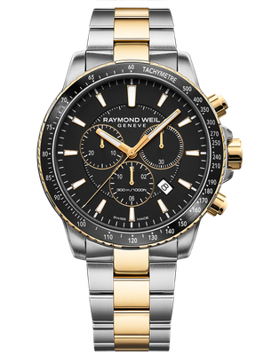 Deliver to: Columbus Ships in 24/48 hrs Raymond Weil Tango Quartz Watch, Movement: Quartz, Case Material: Stainless steel, PVD Gold, Diameter: 43 mm, Crystal: Sapphire, Dial color: Black, Bezel Function: Tachymeter, Chronograph: Chronograph, Calendar type: Day, Crown: Screw-down crown, Case back: Screw-down, Water resistant depth: 30 atm, Bracelet: Stainless Steel and gold PVD, Clasp type: Double folding clasp, Warranty: 2 years, Country of Manufacture: Switzerland, Tachymeter: Tachymeter