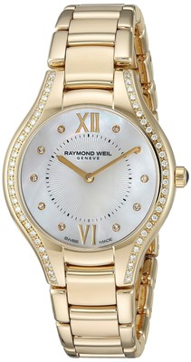 Deliver to: Unknown Ships in 24/48 hrs Yellow gold-plated stainless steel case and bracelet. Fixed yellow gold-plated bezel set with diamonds. White mother of pearl dial with gold-tone hands and diamond hour markers. Roman numerals mark the 6 and 12 o'clock positions. Minute markers around the inner ring. Dial Type: Analog. Quartz movement. Scratch resistant anti-reflective sapphire crystal. Pull / push crown. Solid case back. Case diameter: 32 mm. Case thickness: 7.58 mm. Round case shape. Deployment clasp. Water resistant at 50 meters / 165 feet. Functions: hour, minute. Luxury watch style. Watch label: Swiss Made. Raymond Weil Noemia Mother of Pearl Diamond Dial Ladies Watch 5132-PS-00985. Raymond Weil, located in the heart of Geneva, Switzerland, is one of the last independent Swiss luxury watch companies. Even more uniquely, the company has remained a family business and is currently managed by Raymond Weil's son-in-law Olivier Bernheim, and his sons, Elie and Pierre Bernheim. Raymond Weil opened his watch-making business in 1976 during a very difficult period for mechanical watches. At the time, quartz watches were swiftly replacing their predecessors as a more affordable and equally accurate alternative. However, due to his 26 years of experience in the industry, Raymond Weil's design concepts, impeccable, mechanical movements, and commitment to entirely Swiss-made products earned him a clientele that continued to expand over the past 37 years. Despite the company's current popularity, these high standards have not relaxed, and each Raymond Weil watch passes 350 different checks before being put on the market. Raymond Weil's in-depth knowledge of horology has earned him several prestigious recognitions, including being named President of the Watch Manufacturer's Union of Geneva, Vice President of the Watch Industry's Training Center in Lausanne, member of the Watchmakers' Federation, and President of the Exhibitors' Committee of the World Watch-making and Jewelry Exhibition at Basel. The company's signature motto--"Independence is a state of mind"--is a reminder of its desire to conceive timepieces that are different, elegant and modern, while at the same time displaying all the rigor of watchmaking excellence. See all Product description