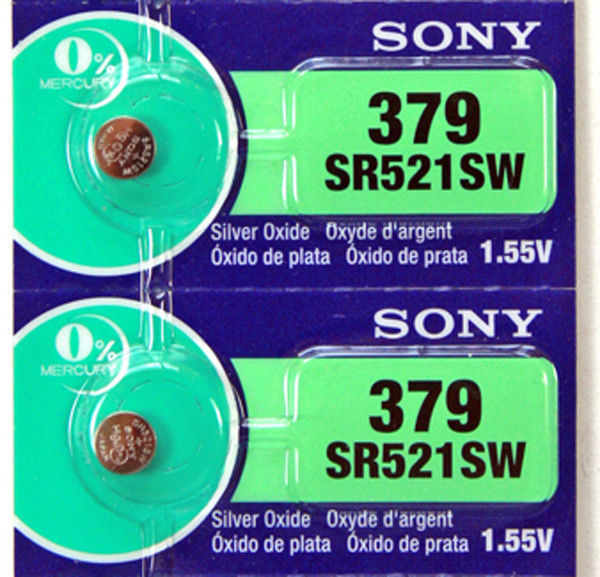 Sony 379 (SR521SW) 1.55V Silver Oxide 0%Hg Mercury Free Watch Battery (3 Batteries) Sony 379 (SR521SW) Silver Oxide 0%Hg Mercury Free 1.55 volts batteries. Sony was the first Corporation to provide the first mercury free silver oxide battery to consumers. Silver oxide batteries are primary cells that have a high energy/weight ratio. Silver oxide is used as the positive electrode (cathode) while zinc is used as the negative electrode (anode) with an alkaline electrolyte. Sony silver oxide batteries provide an extremely high quality, compact battery for the high performance devices today. Sony also ensure consistent reliability and performance in every cell. While Silver Oxide batteries are known for mainly wrist watches the application usage due to the high energy density and discharge characteristics have given the cells a broad range of application usage. Applications: Insulin Pump, Watches, Calculators, Electronic Clinical Thermometers, Remote Controllers, Portable Gaming Systems, Keyless Car Remotes, Radios, Bike Lights, Portable GPS Systems/Bike Computers, Computer/Communication Equipment, camera's and many other devices. Please read and observe the following precautions thoroughly.Improper battery handling may cause leakage, heating, explosion of the battery, which may lead to injury or product failure. Never charge the battery. Charging the battery may cause decomposition of the battery electrolyte or increase of the battery internal pressure. Leakage, heating, explosion of the battery may be caused as a result of it. Keep away from infants. If infant happened to swallow the battery, consult a doctor immediately. Do not heat or disposed in fire or disassemble the battery. When the battery is stored or disposed, isolate positive(+) and negative(-) terminals of the battery to avoid those terminals touch each other. Compatible Sizes/Cross Reference: 379, SR521SW, RW327, 379(50), V379/520, 9938, JA, SB-AC(DC), 280-59