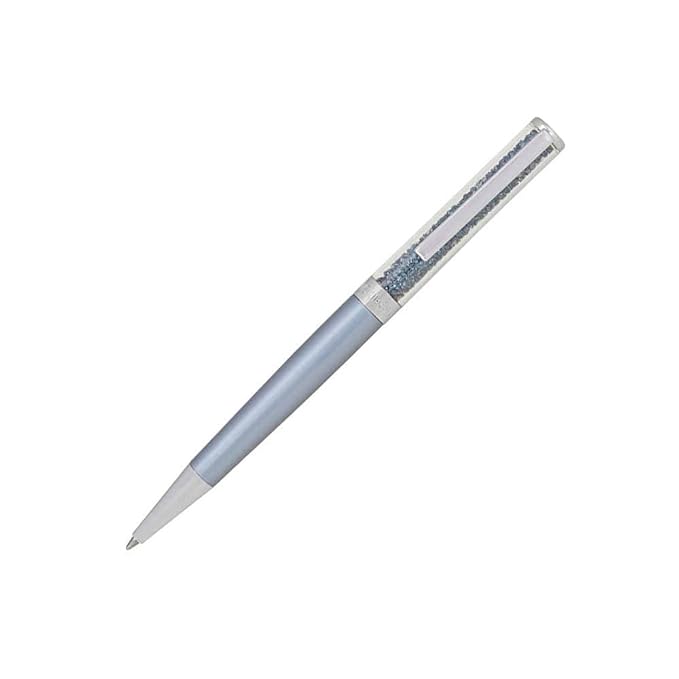 A Swarovski Crystalline ballpoint pen featuring a light grey lacquered metal body, filled with blue-tone crystals, and a silver-tone metal clip.