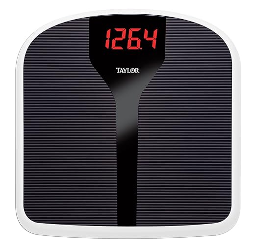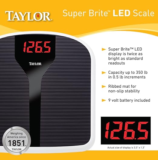 Deliver to: Columbus Ships in 24/48 hrs Taylor LED Digital Scale features a 1.5 LED display for easy reading. Weight Capacity is 400 lb / 180 kg in .02 lb / 0.1 kg increments. Platform size is 12.2 x 12.2 with textured mat. Scale uses 1 9 volt battery, included.