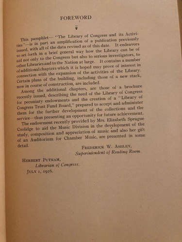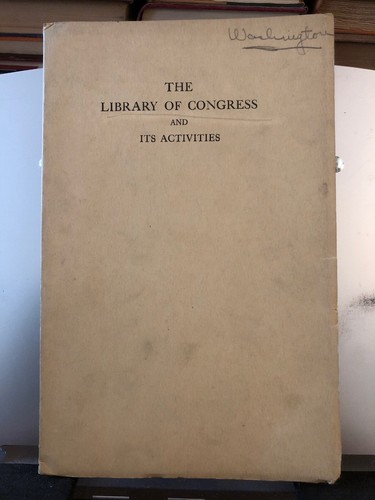 Amplification and revision of a previous publication describing the mission and responsibilities of the Library of Congress. Frontispiece illustration of the main library building. Foreword, bibliography, black and white plate, floor plans. Wrappers lightly soiled. vi , 67+ 1 pages, plates. stiff paper wrappers. 8vo
