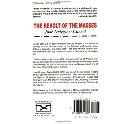 Product Description Social upheaval in early 20th-century Europe is the historical setting for this seminal study by the Spanish philosopher, José Ortega y Gasset. Continuously in print since 1932, Ortega's vision of Western culture as sinking to its lowest common denominator and drifting toward chaos brought its author international fame and has remained one of the influential books of the 20th century. From the Back Cover Social upheaval in early twentieth-century Europe is the historical setting for this seminal study by the Spanish philosopher Jose Ortega y Gasset of the 'mass man'-the phenomenon of mass culture that more than any other factor stamps the character of modern life.