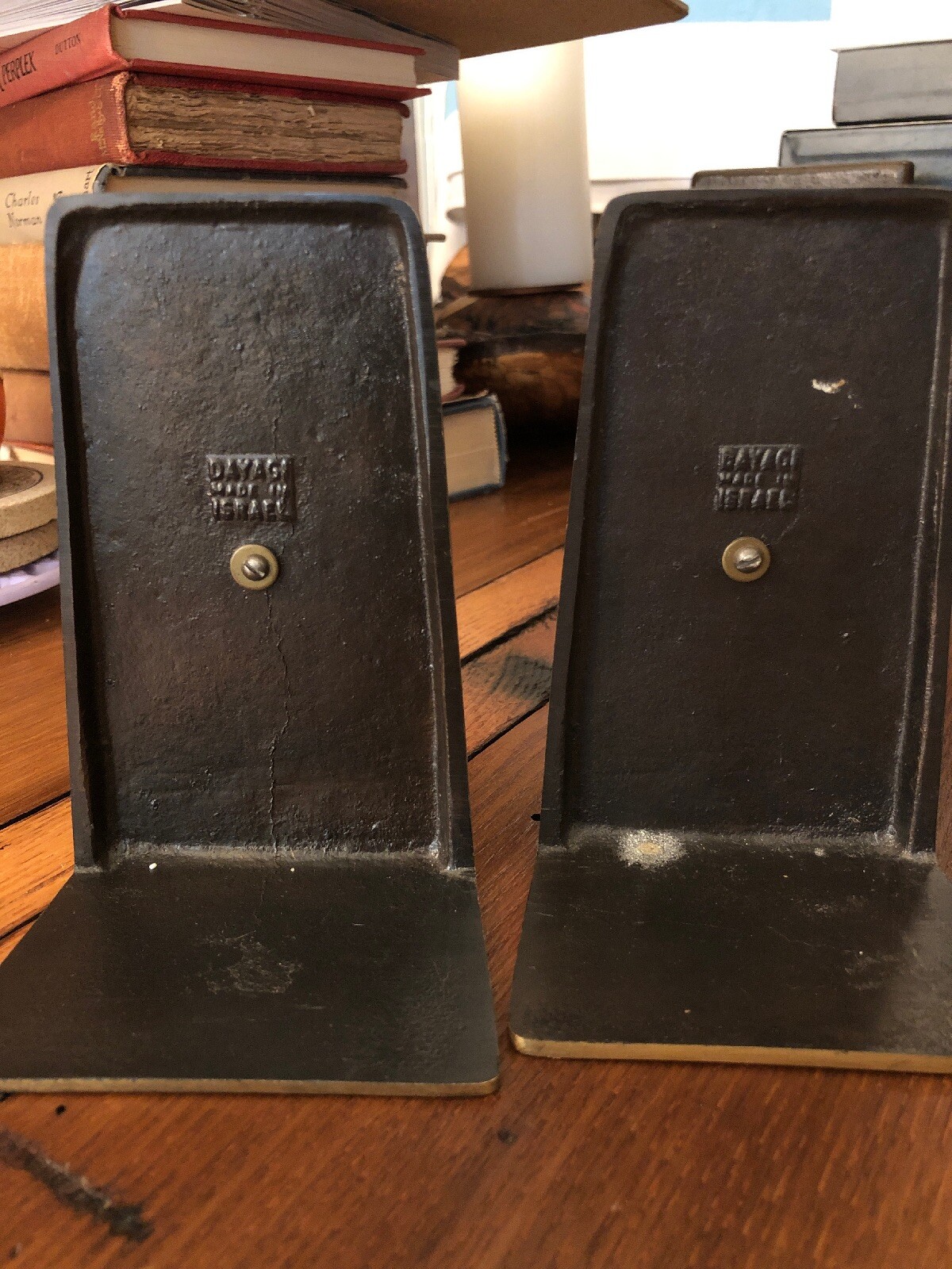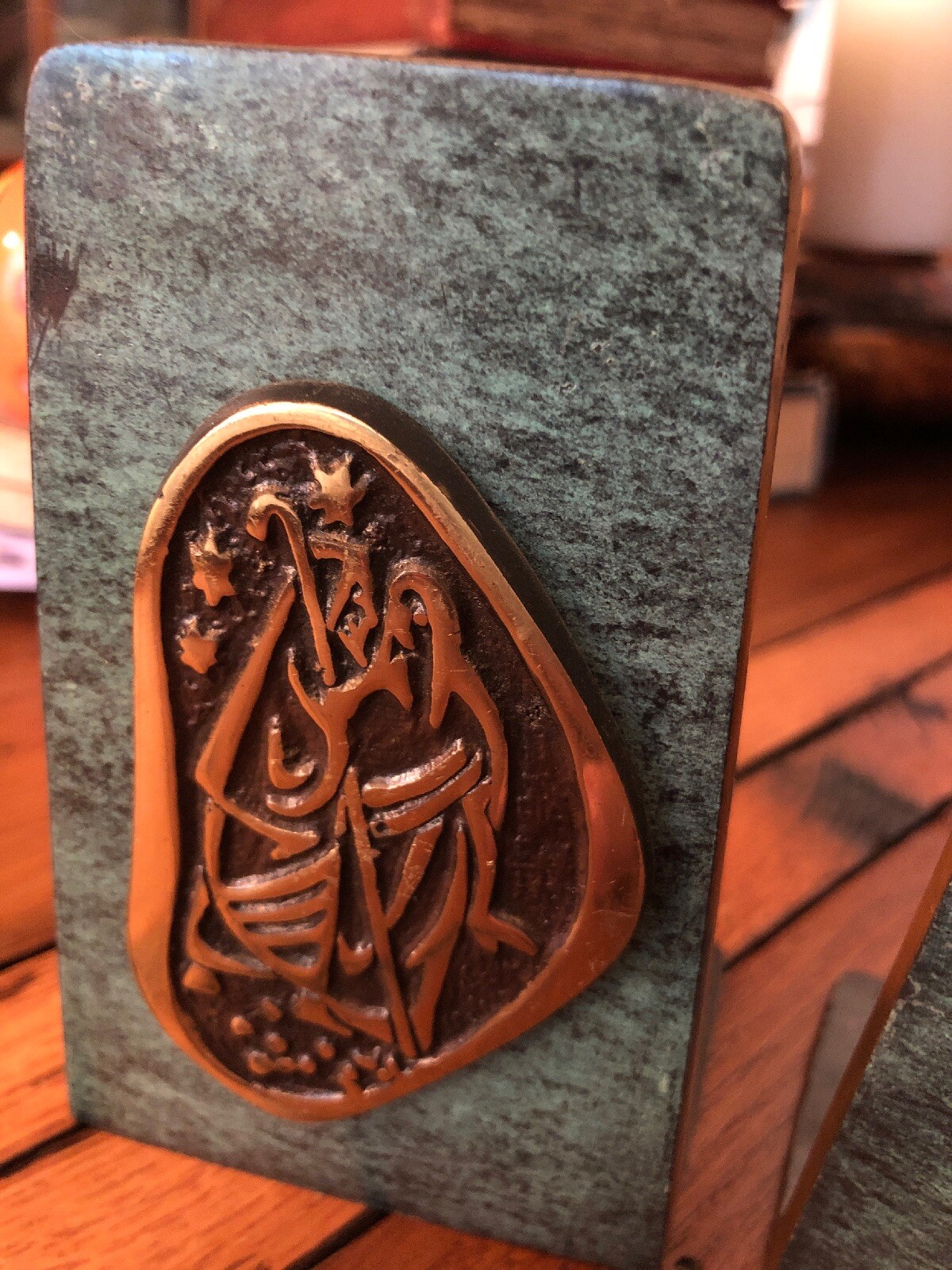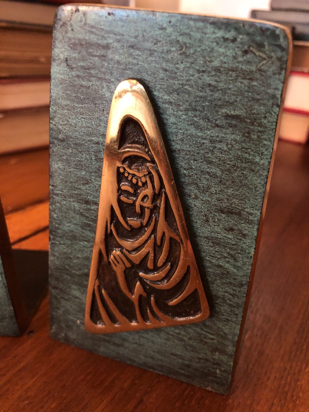 TWO VINTAGE BRONZE GREEN BRASS ENAMEL BOOKENDS MADE IN ISRAEL BY DAYAGI. Condition is Used, Excellent